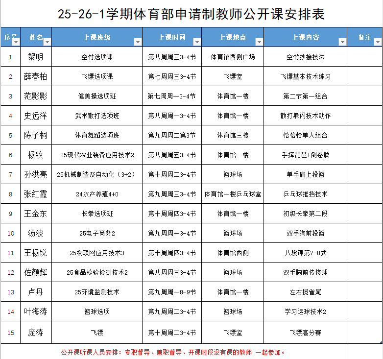 2025-2026-1学期体育部申请制教师公开课安排表